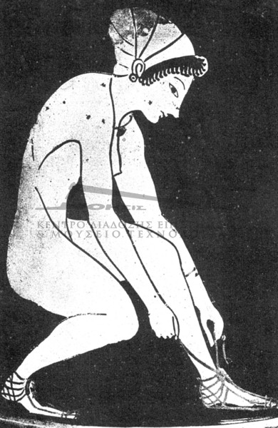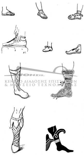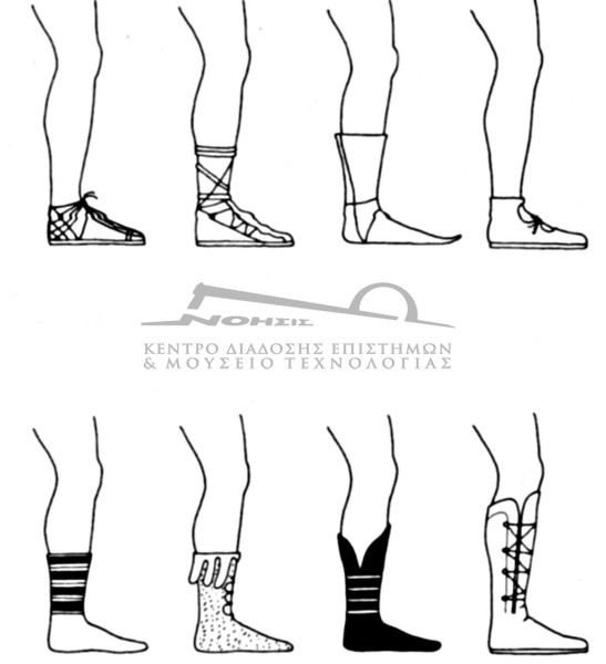 Αναλυτικότερα, τα υποδήματα των αρχαίων Ελλήνων ήταν τα εξής:- οι κνημίδες, υφασμάτινες, δερμάτινες ή μεταλλικές