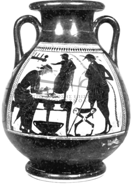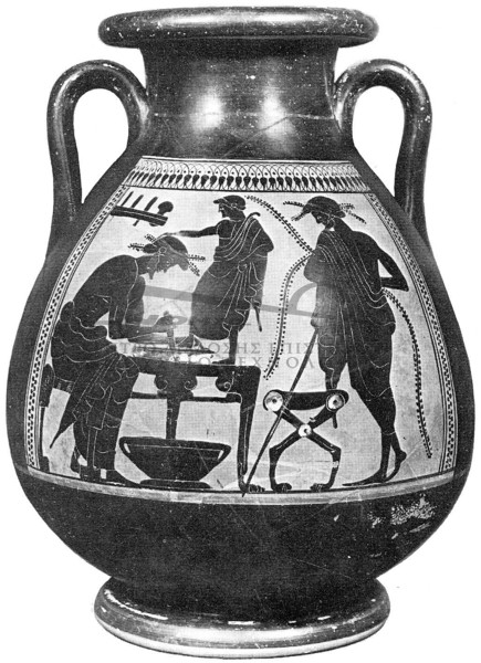 Σε μία κύλικα του 6ου αιώνα απεικονίζεται υποδηματοποιός που χρησιμοποιεί μαχαίρι σε σχήμα μισοφέγγαρου. Στους τοίχους κρέμονται καλαπόδια καθώς και ένα ακόμη μαχαίρι. Σε έναν αμφορέα της ίδιας εποχής απεικονίζεται στο υποδηματοποιείο ο πελάτης να στέκεται όρθιος επάνω στον πάγκο εργασίας του τεχνίτη, πατώντας πάνω στο δέρμα στο οποίο αποτυπώνεται το περίγραμμα του ποδιού του για να κοπεί η σόλα στο νούμερό του. Ραβδιά για μέτρημα χρησιμοποιούνταν από τότε, όπως και σήμερα.Ως προς την αξία των υποδημάτων ο Λυσίας αναφέρει ότι οκτώ μνες το χρόνο ήταν υπερβολικό ποσό για ρούχα, παπούτσια, πλύσιμο και κούρεμα για δύο μικρά αγόρια και ένα κοριτσάκι. Ο Αριστοφάνης θεωρεί 8 δραχμές πολλά λεφτά για ένα ζευγάρι σανδάλια.
