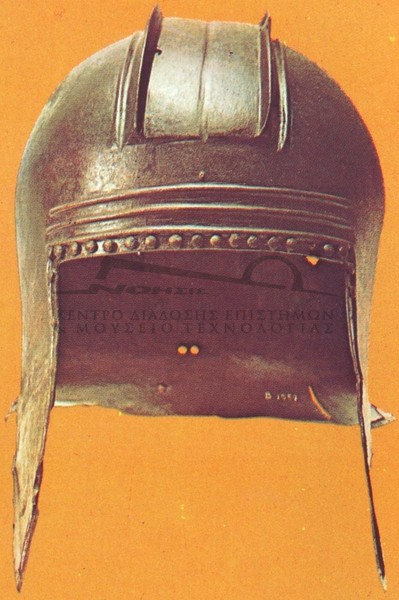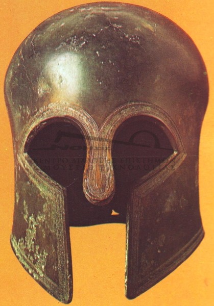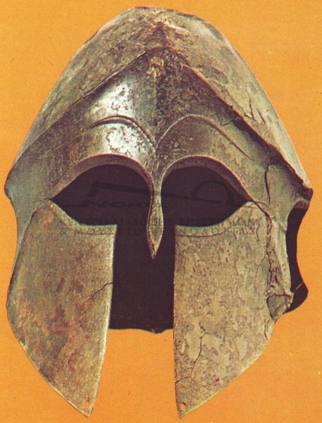 | Ιστορία Ελληνικού Έθνους, Κλασσικός Ελληνισμός(2) , 203, Τόμος Γ2, Εκδοτική Αθηνών 2000 Κράνος καθαρά ελληνικό, που εμφανίστηκε στην Πελοπόννησο τον 7ο αι. Πρόκειται για το λεγόμενο "ιλλυρικό" κράνος.Ολυμπία, Αρχαιολογικό Μουσείο. | ||