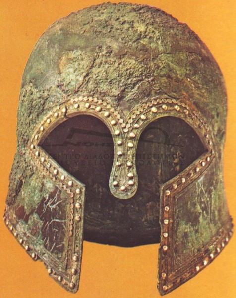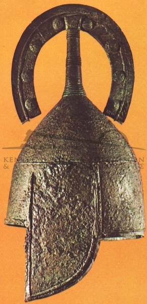 | Ιστορία Ελληνικού Έθνους, Κλασσικός Ελληνισμός(2) , 202, Τόμος Γ2, Εκδοτική Αθηνών 2000 Το παλαιότερο ελληνικό κράνος, που ανακαλύφθηκε σε υστερογεωμετρικό τάφο του Άργους. Αποτελείται από ένα κωνικό σώμα που καλύπτει το μέτωπο και τον αυχένα, δύο παραγναθίδες κι ένα ψηλό λοφίο σε σχήμα πετάλου αλόγου. | ||