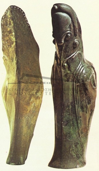 Αριστερά: κνημίδα από την Ολυμπία που προσαρμόζεται θαυμάσια στην ανατομία της κνήμης του πολεμιστή. Δεξιά: κνημίδα από την Ακρόπολη με ανάγλυφη διακόσμηση πτηνών.