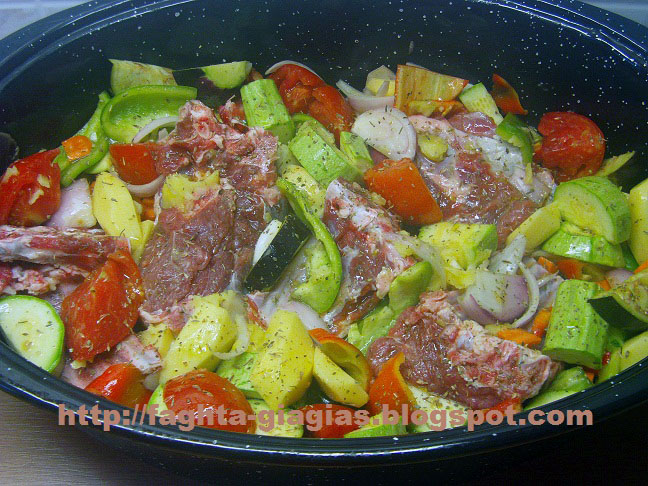 | Πλένουμε το κρέας πολύ καλά και το κόβουμε σε μερίδες. Το αλείφουμε με το μισό λάδι, το αλατοπιπερώνουμε, ρίχνουμε την μουστάρδα και το βάζουμε στη γάστρα. Στη συνέχεια πλένουμε τα λαχανικά, τα κόβουμε σε μεγάλα κομμάτια και τα βάζουμε σ᾿ ένα μπολ. Ρίχνουμε το υπόλοιπο λάδι, αλατοπιπερώνουμε και ανακατεύουμε. | |||||||||||