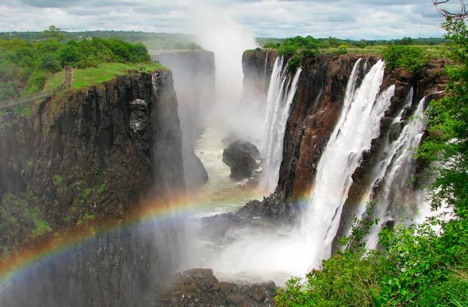 Οι καταρράκτες Βικτώρια ή Mosi-oa-Tunya (Ο καπνός που βροντάει), βρίσκονται στον ποταμό Ζαμβέζη, στα σύνορα Ζάμπια και Ζιμπάμπουε και είναι οι μεγαλύτεροι στον κόσμο. Τα νερά πέφτουν ορμητικά από ύψος 108 μέτρων, από ένα άνοιγμα που φτάνει τα 1708 μέτρα. Παρά τα εντυπωσιακά νούμερα όμως οι καταρράκτες Βικτώρια δεν είναι ούτε οι πιο ψηλοί ούτε οι πιο πλατείς. Χαρακτηρίζονται όμως οι μεγαλύτεροι στον κόσμο καθώς σχηματίζουν τη μεγαλύτερη επιφάνεια νερού που πέφτει. - Πυραμίδες της Γκίζας