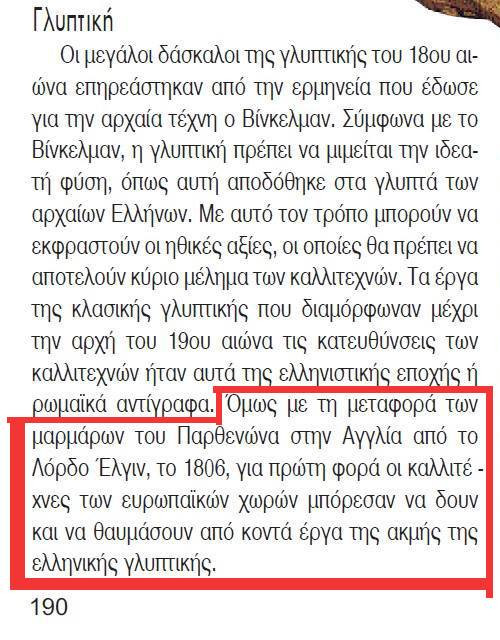 Μετά από αυτή την αποκάλυψη, αποσύρεται από το προσεχές έτος το βιβλίο της Ιστορίας της Τέχνης της Γ’ Λυκείου μετά τις επικρίσεις που διατυπώθηκαν για το γεγονός ότι η κλοπή των Γλυπτών του Παρθενώνα από τον Λόρδο Έλγιν παρουσιάζεται ως «μεταφορά».