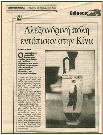 Κι όμως στην Κίνα βρέθηκε αρχαία ελληνική πόλη. Αυτό μας λέει το δημοσίευμα της Μελβούρνης το 1993. Ή για να ακριβολογούμε: σε πανάρχαια κινεζική πόλη είχαν εγκατασταθεί στρατεύματα του Αλεξάνδρου, τα αντικείμενα των οποίων έμελλε να βρεθούν 2.300 χρόνια μετά.